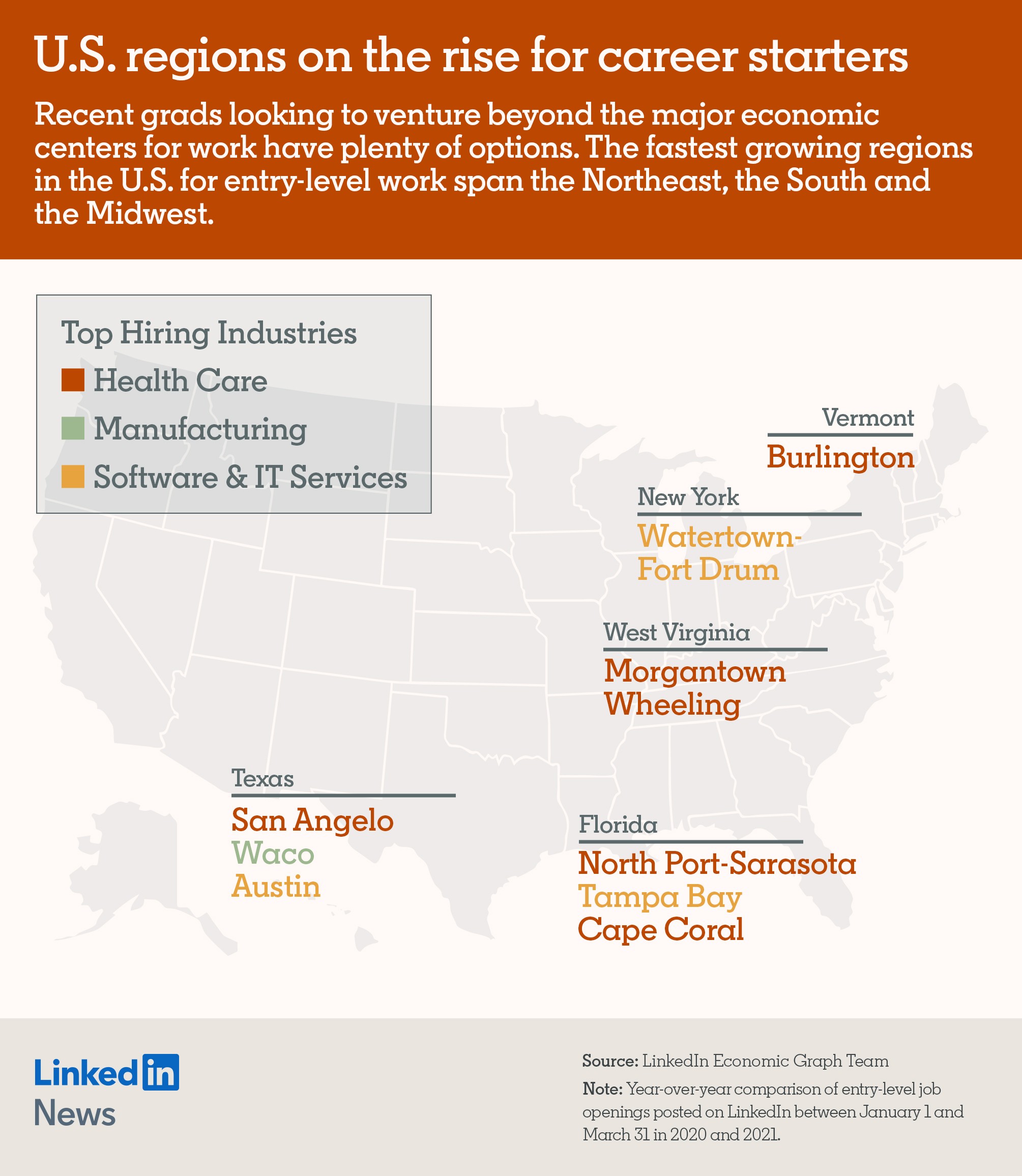 If the pandemic taught us one thing it was that the workforce is resilient and where people do their day to day jobs has grown in exponential ways. If you’re someone who isn’t looking for the big city vibe to start your career, here are the fastest growing regions with entry level job postings.